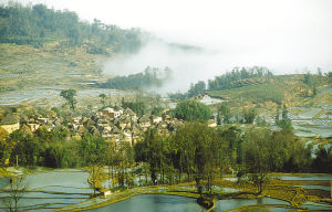沿着公路旁的村道走下去,还要约半小时才能到箐口,一路上两边都是梯田,偶尔能看到妇女在耕种。与云南山区的许多民族一样,哈尼族的农活也经常由女人来承担,成年男子则负责带孩子。相对来说,他们要悠闲许多。虽然垦殖梯田需要砍伐山林,但实际上,哈尼族人一向注重对树木的保护,他们往往把树木同祖先相联系,每年3月,还会举行盛大的祭树神的活动。