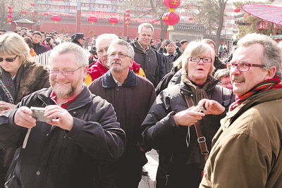 ▲2月23日,来自丹麦的游客在北京白云观庙会参观游览,感受中国春节民俗文化。新华社记者张燕辉摄