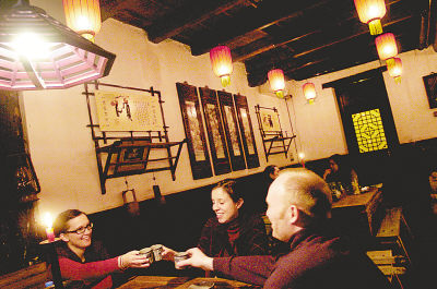 ▲2月23日,三位来自瑞士的游客在平遥古城一家民俗客栈用餐。据山西省旅游局介绍,今年有万余名海内外游客在平遥古城过春节。新华社记者江宏景摄