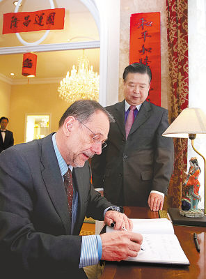 ▲2月22日,在位于比利时布鲁塞尔的中国驻欧盟使团团长关呈远大使官邸,欧盟负责外交与安全政策的高级代表索拉纳(前)在留言本上留言。索拉纳当天在中国驻欧盟使团大使官邸出席午宴时祝全中国人民新年快乐。新华社记者徐金泉摄