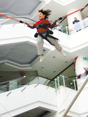 2月22日,在南京的新城市广场,一个小朋友体验室内蹦极。春节期间,新奇刺激的室内蹦极受到南京市民的青睐,不少家长带着孩子前来体验。王新摄(新华社发)