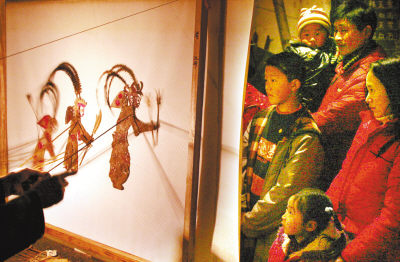 2月22日晚,山东省枣庄市山亭区宋庄村村民带着孩子欣赏皮影戏。春节期间,当地民间皮影艺人在附近乡村巡回义演。新华社发