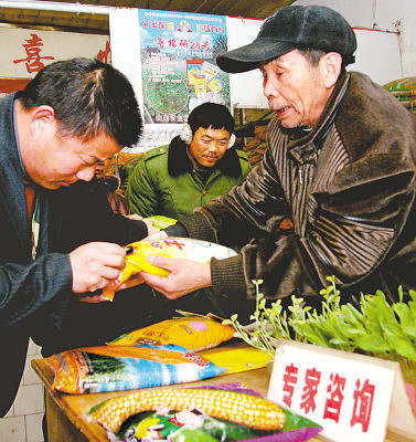 2月24日,到台儿庄一良种销售点选购种子的农民向高级农艺师进行咨询。新春伊始,山东省枣庄市台儿庄区开通“良种下乡快车”,设立14处良种销售点,切实方便农民就近购买放心的良种。高启民摄(新华社发)