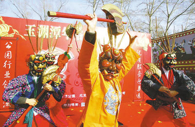 春节期间,汉族最古老的娱神舞蹈——傩舞走进北京玉渊潭公园首届春节年俗文化展演会现场,其质朴、粗犷的舞蹈和性格鲜明的面具,显现出古代中国舞蹈和雕塑艺术的原始美。古时每逢打醮、新春人们都跳傩舞,祈福禳灾,自娱自乐。婺源的傩舞节目多为神话和民间传说故事,表演非常古朴、粗犷、夸张、简练。本次展演会是“2007年海淀新春文化体验活动”的一部分,以“各民族年俗文化和谐共舞迎奥运”为主题,展示各民族原生态年俗文化。本报记者李建泉摄