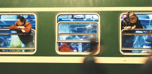 ▲两名乘客趴在车窗边向外张望。许多人只有到了明年春节才能回家。