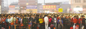 空旷的广场上,醒目地竖着写有北京方向、广州方向、上海方向的大牌子,安徽阜阳是全国5大劳务输出地之一。2006年,900多万人口的阜阳市全年劳务输出总量突破200万人,达到203万人,比上年新增近13万人。当地有关部门预计,今年外出务工人员还要增加,而这一群体中80%以上又是青壮年。春节期间,因承担劳务输出任务繁忙,多年来外界把阜阳火车站称作“农民车站”。