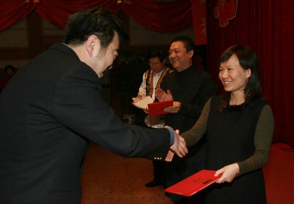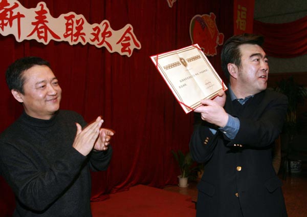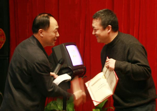 《冰点周刊》荣获2006年度特别奖。党组书记王宏猷(左)向《冰点周刊》主编杜涌涛颁奖
