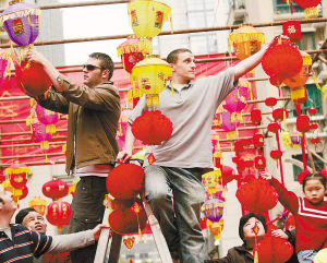 2月28日,杭州灵隐街道黄龙国际商务中心党委和黄龙社区共同举办了中外居民自制灯笼比赛。来自美国的黑虎、大卫和帝姆在“关公”面前耍起了大刀,和黄龙社区的当地居民比起了扎灯笼的手艺,还将自己制作的灯笼挂了起来。