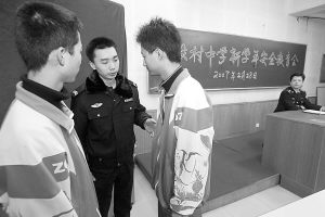 2月28日,北京中关村中学,民警假扮社会人员通过同学找同学,向大家进行人身安全防范知识宣传。当天是北京市中小学开学第一天。 董世彪摄