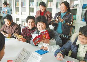 在河南省西平县盆尧乡于营村“新农村书屋”里,村民们正在兴致勃勃地阅览图书。目前,该县20多个行政村建起了“新农村书屋”,总藏书10多万册,催生出养殖、食用茵、果树等科技户近千户。作为当地新农村建设的重要内容,“新农村书屋”将在西平全县各行政村普及推广。