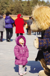 在春节地坛庙会上,一个漂亮的小姑娘闯入了我的镜头,当我准备拍照时,她却故意躲避。但当她发现了前边的抱抱熊之后,马上没有了任何戒备,跑过去像老朋友一样向抱抱熊微笑,与它握手,走时还礼貌地与它摆手再见。