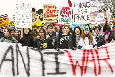 一名妇女向人群喊道:“弹劾布什、弹劾切尼、弹劾盖茨。”虽然刚刚上任不久,国防部长盖茨也和他的上级一样成为了人们唾弃的对象。