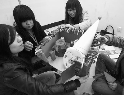 图:团队精神是考查目标,据考官介绍,面试分为两部分,首先考生须运用校方提供的废纸盒等物品完成一个手工制作,接下来考生要根据各自的作品,与其他考生自由组合成小组进行二次创作,将作品融会成一个主题。欧阳晓菲摄