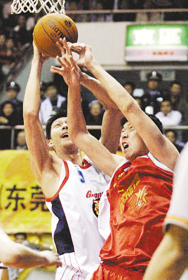 3月20日,在CBA总决赛第二场比赛中,广东宏远队在主场以97∶57战胜八一队,双方总比分打成1∶1。图为广东队的易建联(左)与八一队的王治郅在篮下争夺。新华社记者刘大伟摄