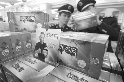 照片:3月16日,北京海淀和西城工商分局针对央视“3·15”晚会上曝光的由相声演员郭德纲代言的减肥产品“藏秘排油”进行清查。