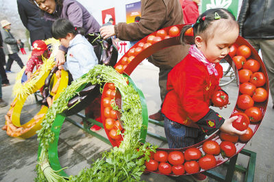 茄子拼成黑色环,芹菜拼成绿色环,韭菜黄拼成黄色环……3月21日,在北京东高地万源文化广场举办的社区文化节上,数十名社区居民用蔬菜拼成“奥运五环”标志,向参加社区文化节的居民展示绿色奥运、环保奥运的理念。范继文摄