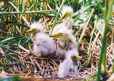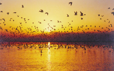 春季,鸟儿把巢筑在水边的苇秆间、芦丛底,各种颜色的鸟蛋散布其间,可称得上是大自然中的奇观。许多鸟妈妈卧在窝里,等待自己的小宝贝出生;还有些鸟仿佛很空闲,在地上蹦来蹦去;而有些雄鸟好像很爱出风头,一圈一圈地在领地上飞着,雌鸟们却仍然安安静静地保护它们的蛋。再过些日子,毛茸茸的雏鸟就随处可见了。轻微的响动也会惊起上万只飞鸟,黑压压一片如移动的云在空中盘旋,遮天蔽日,鸣叫不已。