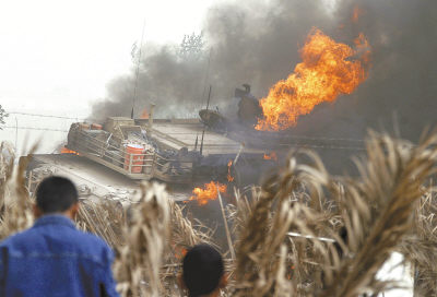 照片:2006年3月10日,伊拉克巴格达,伊拉克人正在观看一辆燃烧的美国“艾布拉姆斯”主战坦克。正当美国军事巡逻队在巴格达东部巡逻时,一个瞬时炸弹爆炸,致使美国一辆坦克着火。盖蒂摄