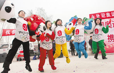 3月22日上午,北京市崇文区永外街道举办“百姓携手,情系奥运”主题全民健身日活动,憨态可掬的5个“福娃”也加入到迎接奥运倒计时500天的队伍中。董一鸣摄