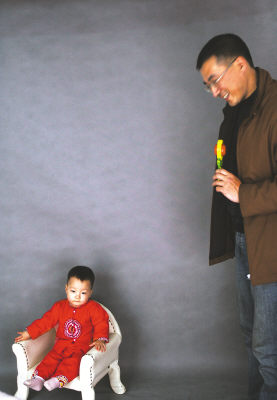 春节前夕,哈尔滨一家人带着8个月大的孩子拍艺术照。当天孩子的心情不算好,这下可忙坏了家长,所有人都在摄影棚的不同位置试图逗孩子开心。图为孩子父亲站在角落想办法把小女儿逗乐,我这个负责拍摄花絮的人记录下了这个温馨的瞬间。