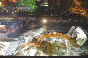 3月28日,抢救人员在清理事故现场。当日,位于北京市海淀南路的地铁10号线工程苏州街车站东南出入口发生一起塌方事故,6名施工者被埋。截至当日20时30分,北京市有关方面仍在组织抢救。目前6名工人生死未明。