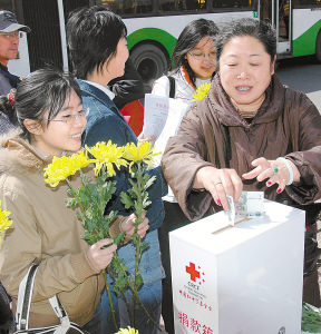 3月31日,一名前来扫墓的女士向“红十字书库”捐款后得到志愿者送上的一束鲜花。当日,在北京八宝山地铁口,十余名志愿者和红十字书库的工作人员义卖扫墓所需的菊花,所得款项将捐献给红十字书库公益事业,用来帮助贫困地区缺少书籍的孩子。