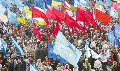 3月31日,在乌克兰首都基辅市中心,议会多数派的支持者参加集会。当天,乌克兰议会多数派的支持者在市中心举行集会,支持现政府,并要求总统尤先科与议会合作。而几乎与此同时,乌议会反对派也在市中心举行集会,要求总统解散现议会,重新举行议会选举。新华社/法新