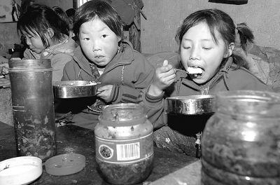 3月29日,三年级的申琦(右一)与同学在一起就餐。地处秦巴山区的陕西省洋县酉水小学共有294名学生,有128名学生因为居住地距离学校太远,只能选择住校。这些住校生从家里带上大米到学校,大米蒸熟后拌上辣酱和咸菜,便成了这些孩子们的午餐。洋县是国家级贫困县,没有被列入国家“农村寄宿制学校建设工程”,要想从根本上解决学生们的住宿和伙食问题,还需整个社会及各界热心人士的关爱。新华社记者陶明摄