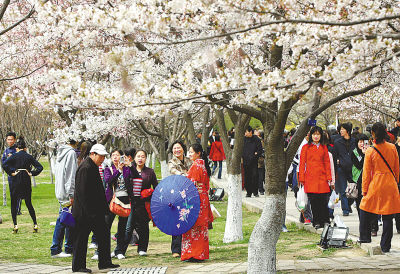 4月4日,春风吹开了樱花,在北京玉渊潭樱花文化展上,游人纷纷前来踏青赏樱。此次文化展以“敲响春天”为主题,融入了风铃展示,以及迎奥运和樱花知识问答等内容。随门票赠送的《赏樱花指南》,让游人增长了赏樱知识。本报记者李建泉摄