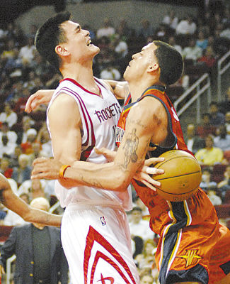 |        上赛季常规赛最后阶段,姚明、麦蒂因伤退出,火箭队一落千丈。4月5日,火箭队好像重新回到了那个“糟糕岁月”,姚明全场只得到9分,麦蒂出场不到7分钟,1分未得并且受伤下场,火箭队在主场以99∶110不敌勇士队遭遇两连败。    本场比赛,姚明完全被对手遏制,《旧金山纪事报》一篇题为“勇士队给姚明一记重锤”的文章称:勇士队打出了本赛季最漂亮的一场比赛,身高2.06米的艾尔·哈灵顿完成了一个不可能完成的任务:他紧贴在姚明的身前,让姚明无所适从。    《休斯敦纪事报》说,火箭队在麦蒂离场之后,应该让姚明也离开赛场,只有那样,他们才能知道怎么打球。    纪事报的评价并非没有道理,姚明本场被对手完全遏制的情况下,火箭队队员还在苦苦地寻找姚明,结果,火箭队的失误达到了23次,仅比本赛季最差纪录少一次。赛后,范甘迪大怒,他把全队失误多和姚明低迷的问题一起评价:“听着,无论别人对姚明做什么,其他队员要保持清醒,只要有机会投篮,一定要坚决!如果对每一支球队我们都把球传给姚明,我们也实在太呆板了。我们的队员应该大胆去投篮,去进攻,因为我相信,姚明打任何队伍都能抢到进攻篮板球,他可以选择很多种的进攻方式。”    姚明全场只获得了4次出手机会,“我们知道他们会绕前防守。”姚明在赛后沮丧地说,“我从比赛的第一分钟就知道了。但是,我们全队太犹豫了,投篮、传球、突破、一切我们都做得很差。”    麦蒂的伤势并无大碍,如果这对火箭队算是好消息的话。“没关系。”麦蒂很轻松地说,“我只是感觉很不舒服而已,我不会担忧,大家也不必担心。”    照片:姚明被断球。小艾摄     |