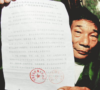 照片:这是一名学生家长展示收到的“严格控制初中辍学的通知”。新华社记者张国俊摄