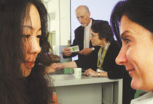 4月5日,在中国人民大学新闻学院举行的阿里克西亚基金会新闻摄影研讨班上,受到基金会资助的女摄影师艾米(右)正与一位中国同行交流。当天,参与研讨的外国专家对人大学生的作品进行了面对面的点评。作为一个非营利组织,该基金会的目标是通过纪实摄影推进世界和平,它除了提供奖金帮助入选的摄影师和学生拍摄外,还将获得资助的学生送往英国学习。