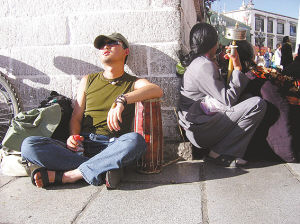 ▲在拉萨街头晒太阳