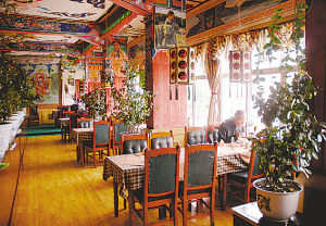 DUNYA是一家外国夫妇经营的餐吧,主营西餐和尼泊尔餐。DUNYA在阿拉伯语、土耳其语、印度语等很多国家的语言中都是“世界”的意思,也许就是因为这个好名字,这里总是高朋满座。DUNYA的招牌菜是牦牛排,配上浓郁的酱汁,加上拉萨啤酒简直天下无双。这里的一种酸奶饮料:香蕉酸奶,是用藏区特制酸奶加上打碎的香蕉制成,香醇柔滑。有时间的话,在二楼酒吧外的阳台上晒晒太阳,品尝着香蕉酸奶和巧克力雪糕,你享受的就是世间最惬意的午后时光。