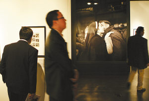 4月12日,首都博物馆,参观者在法国摄影大师维利·罗尼的作品《战俘之吻》前驻足观赏。
