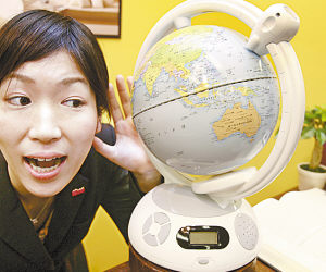 4月12日,在日本首都东京,一名玩具厂商的员工展示一个“会说话的地球仪”。这个地球仪直径20厘米,底座配有LED显示屏。它的独特之处在于能够发音说出各个国家或地区的名字、当地时间以及有关这个国家或地区的其他信息。