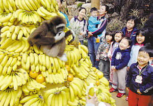 4月12日,在韩国首都首尔以南的龙仁市一家游乐园,一只长臂猿舒服地坐在用水果堆成的“花果山”上吃香蕉,引得围观的儿童哈哈大笑。这家游乐园堆起这座“花果山”是为了庆祝名为“友好猿猴谷”的猿类主题公园向游人开放。新华社/法新