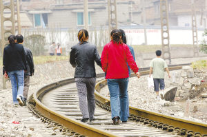 4月13日,几位行人随意走在贵昆铁路线上。4月18日全国铁路将第六次大提速,在贵阳火车站北约三四公里处路段,一些行人为走近道,将铁路当马路行走,存在着安全隐患。