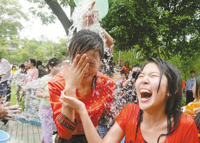 4月14日,广西民族大学为了让泰国留学生及来自我国云南西双版纳的傣族青年欢度傣历新年佳节,在校园广场举行一年一度的“泼水节”联欢活动。大学生手提塑料桶、脸盆等生活用具参加泼水活动,不亦乐乎。张磊摄