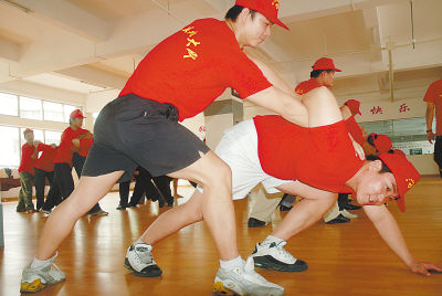 4月15日,志愿反扒队员练习擒拿术。当日,海口市义务志愿者反扒大队进行成立后的首次强化训练,近百名队员在警官指导下学习擒拿本领和防身术。彭桐摄(新华社发)