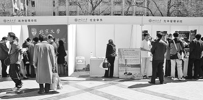 4月14日,北京大学2007年校园开放日暨本科招生咨询会在北京大学校本部和医学部同时举行,北京大学各个院系、国家重点实验室、图书馆、各类博物馆向社会开放。在北大百年讲堂广场,北大招生办、北大北京招生组、北大医学部招生办、各个院系、校内各有关单位设置展台由专人面对面解答考生、家长关心的问题。北京大学今年本科计划招生3300人。记者注意到,政府管理学院和光华管理学院的展台前人潮不断,而中间的社会学系展台却门可罗雀。本报记者周凯摄