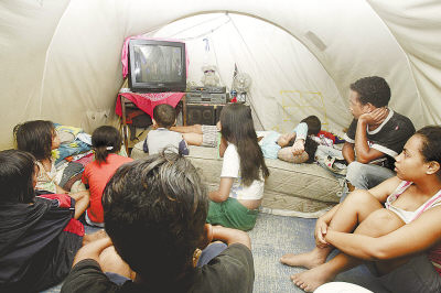 4月11日,在东帝汶首都帝力一处难民营里,人们在窄小的帐篷里看电视。