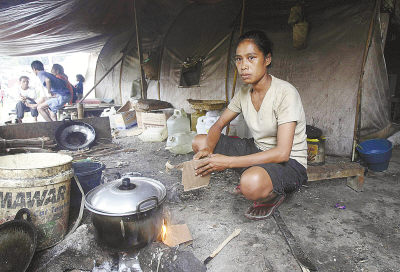 4月11日,在东帝汶首都帝力一处难民营里,一名妇女在简陋的帐篷中生火做饭。