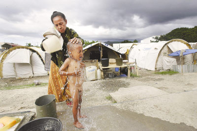 4月8日,一名妇女在东帝汶首都帝力的一座难民营内给孩子洗澡。
