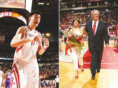 照片:姚明在艰难战胜太阳队后兴奋得大叫,火箭队总经理道森携妻子在赛后宣布退休。国新摄