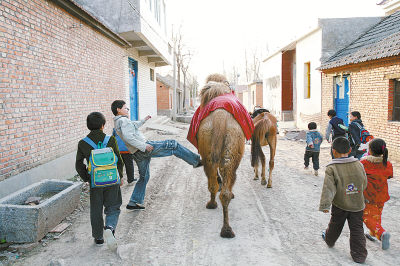 每到一个村子,总有一些调皮的孩子追着骆驼打闹。