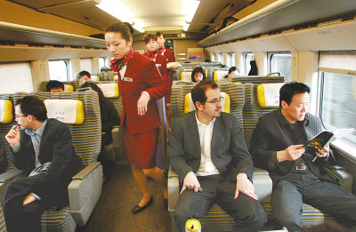 4月18日,从北京开往天津的“和谐号”动车组D533次列车上,乘务员为乘客提供饮料、食品。动车组的列车服务分工更细,卫生、餐饮都由专门的保洁、餐饮公司提供,这些公司都经过市场招标后进入“和谐号”列车。本报记者赵青摄