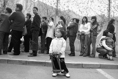 照片:2007年4月18日,北京,望京新城幼儿园门口一大早就排起了长队,为孩子入园,家长熬夜排队报名。