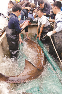 这两尾野生中华鲟2005年在长江宜昌段产卵时受伤,当时被运到北京海洋馆疗伤调养。科研人员已为这两条中华鲟打上标记,并在体内植入跟踪器和芯片,以更好地对其在长江内的活动进行监测和研究。新华社记者杜华举摄
