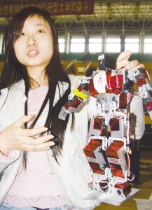 南京师范大学一位同学正在向参赛选手介绍“舞蹈机器人”的工作原理。日前,“挑战杯”五环科技运动会在南京师范大学体育中心举行,来自南京大学、东南大学、南京师范大学等六所高校的近千名大学生参加了科技运动会比赛,选手们通过参加“承重地带、动力齿轮、撞击星球”和科技作品展示等项目的角逐,体验科技运动会带来的科技创新魅力。(荀海)